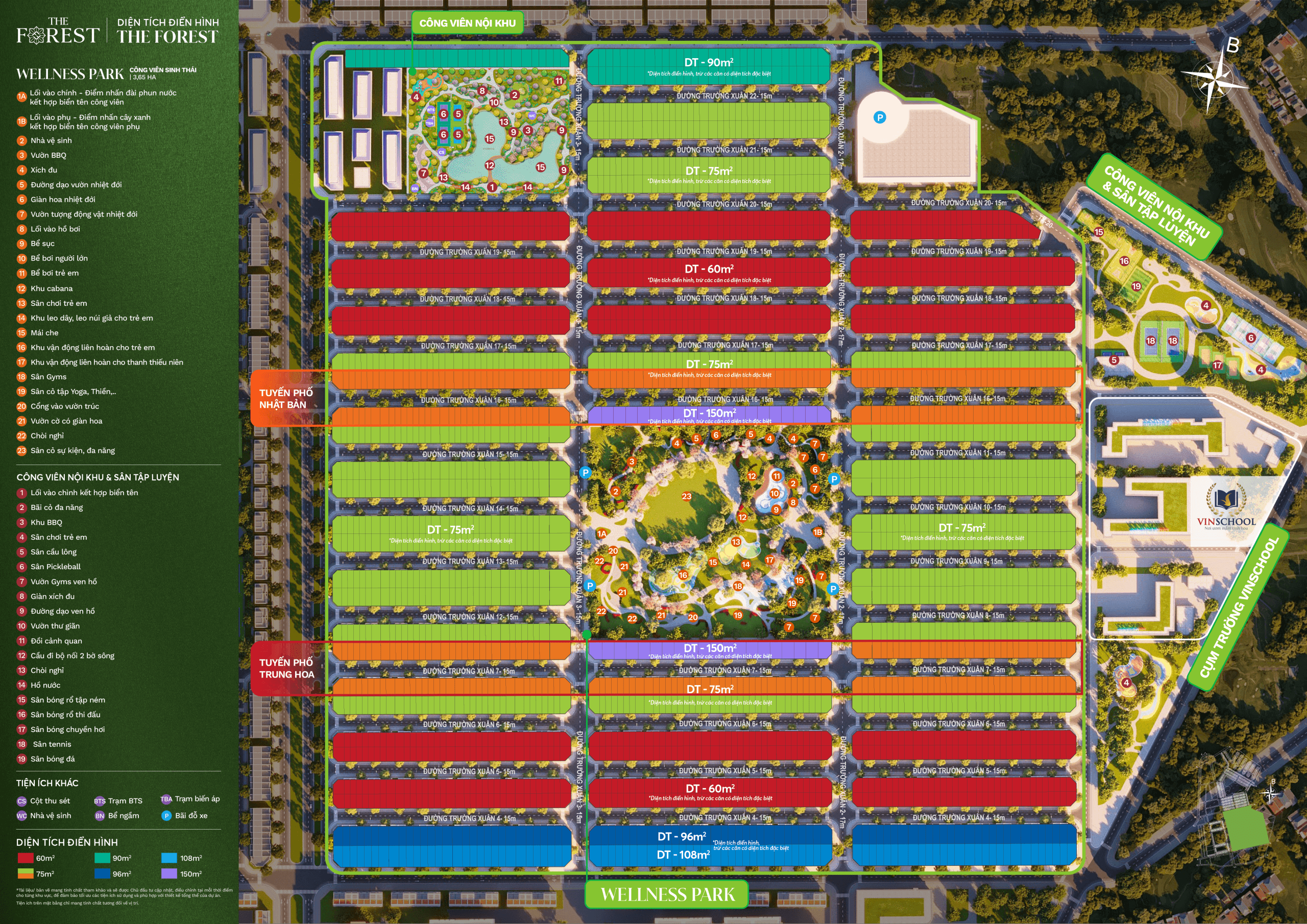 - Môi trường sống xanh mát, cảnh quan sinh thái bao quanh, tâm điểm là công viên The Wellness Park rộng 3,65ha