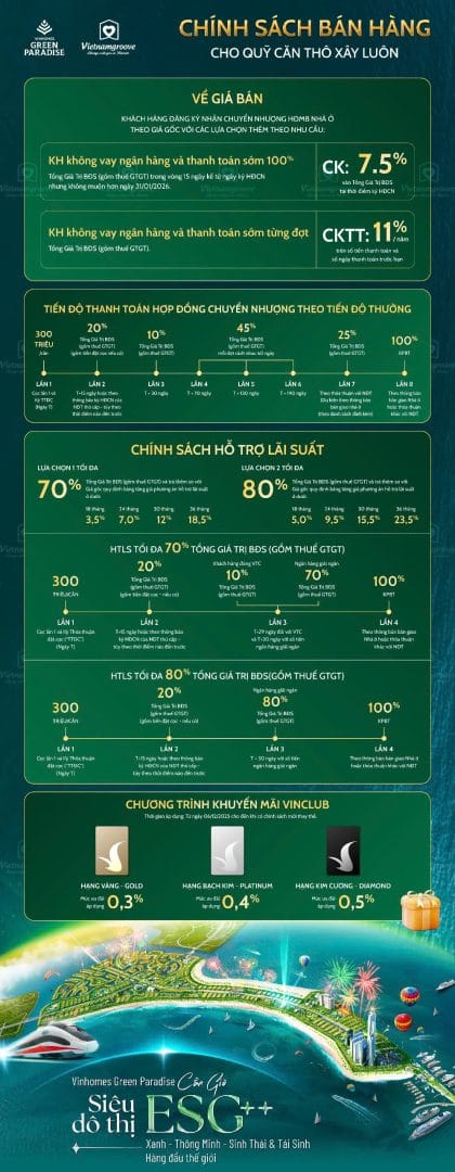 Khám phá chính sách bán hàng Vinhomes Green Paradise với ưu đãi lớn, tiến độ thanh toán linh hoạt và hỗ trợ vay hấp dẫn. Bài viết phân tích chi tiết để nhà đầu tư nắm bắt cơ hội sở hữu sản phẩm đắt giá tại siêu đô thị biển Cần Giờ. Chính sách bán.