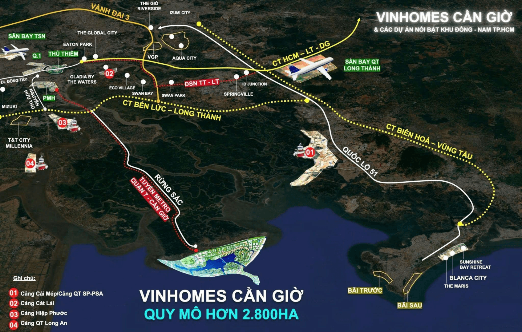 - Cao tốc Bến Lức – Long Thành (Dự kiến 2026): Tuyến cao tốc này kết nối trực tiếp Vinhomes Green Paradise Cần Giờ với Sân bay quốc tế Long Thành, mở ra khả năng giao thương hàng không và du lịch toàn cầu, tạo điều kiện cho các chuyên gia quốc tế lưu trú và làm việc tại đây.